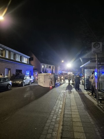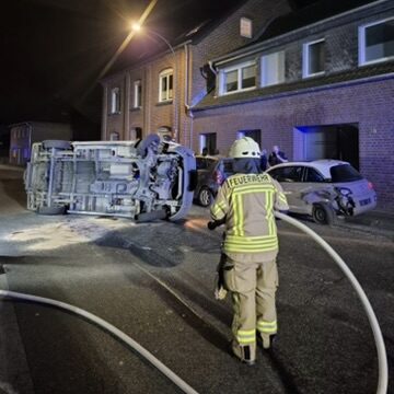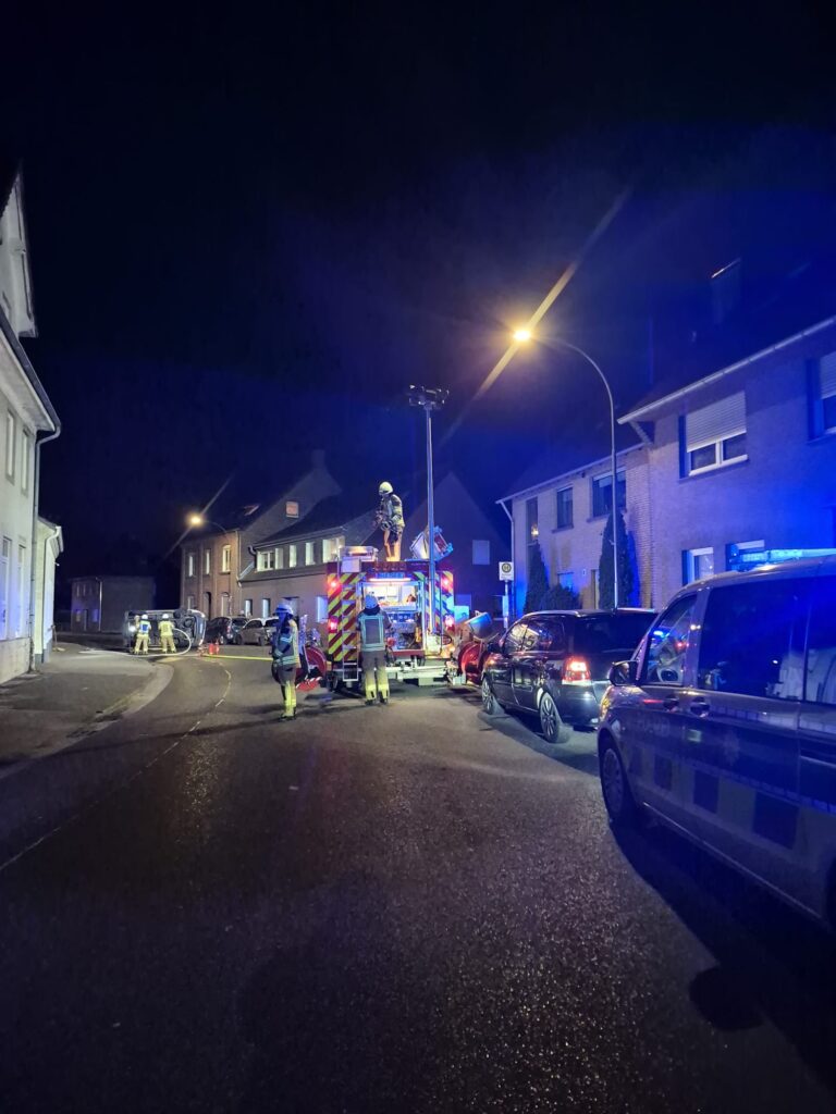 Ein Fahrzeug beschädigte beim Vorbeifahren drei geparkte PKW und kam dabei selbst auf der Seite auf der entgegenkommenden Fahrspur zum Stehen. Der Fahrer wurde durch Ersthelfer befreit und betreut ehe der Rettungsdienst diesen übernahm und später in ein naheliegendes Krankenhaus verbrachte. Die Feuerwehrkamerad:innen stellten aufgrund auslaufenden Kraftstoffes den Brandschutz sicher und sicherten gleichzeitig die Einsatzstelle gegen den fließenden Verkehr ab. Ebenfalls wurden Maßnahmen ergriffen, um die Kanalisation vor den auslaufenden Betriebsstoffen zu schützen.